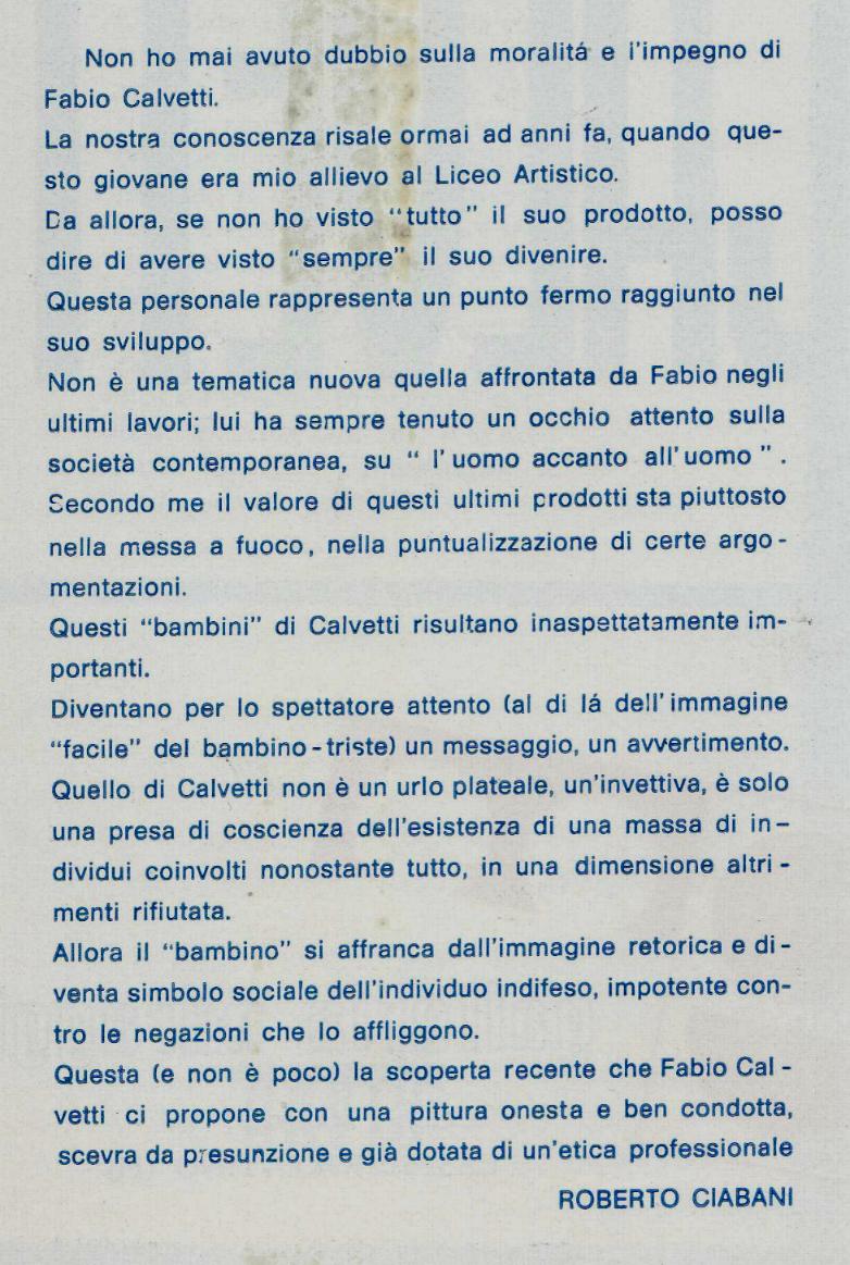 Negli ultimi decenni l’arte contemporanea sta segnando in più modi il territorio valdelsano. Allo scopo di rendere più chiara l’incidenza di tale fenomeno e di coglierne i molteplici aspetti, abbiamo ritenuto opportuno interpellare direttamente coloro che – artisti, galleristi,curatori e critici – sono stati e sono protagonisti in questo ambito. Cominciamo quindi dall’intervista che Fabio Calvetti, artista certaldese il cui valore è oggi riconosciuto a livello internazionale, ha concesso al nostro consigliere Enzo Linari, nella quale ricostruisce la sua carriera sullo sfondo degli eventi, locali e non, che più lo hanno coinvolto . Vista l’ampiezza dei temi trattati, la pubblicazione avverrà in più fasi, suddivisa secondo i diversi periodi presi in esame.